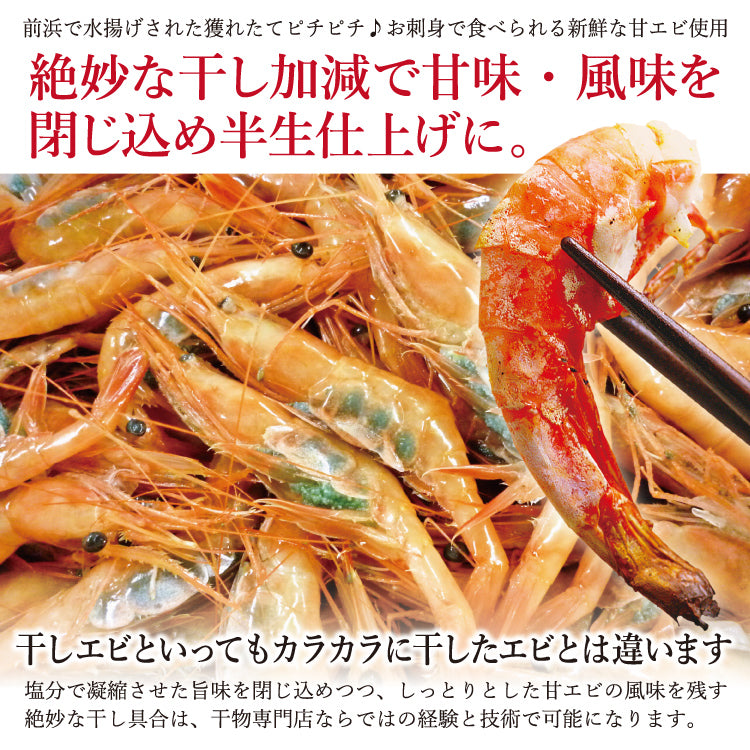 ポイント : お刺身でも食べられるほど新鮮な地元越前の海で獲れた甘エビを天然塩“越前塩”で一塩干しにしました。一般的な干しエビと違い、干物専門店の経験と技術を活かし、旨味は閉じ込める絶妙な半生に干しあげました。人気情報番組“ちちんぷいぷい”でも紹介していただきました。