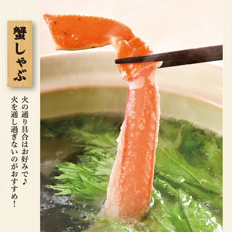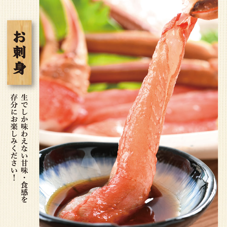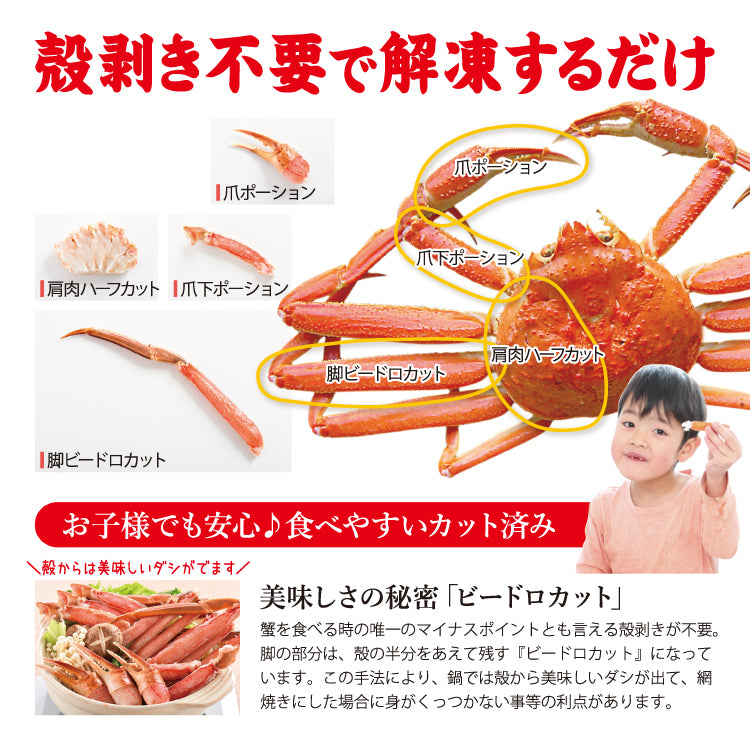 ポイント : 高鮮度なので生でも食べられます!生ならではの繊細な甘味をご堪能ください!カット済みなので面倒な殻剥き不要です。あえて殻を半分残してカットしてあるので、かにしゃぶ、かに鍋では美味しいダシがでます。天ぷらやバター焼きもおススメ!いろいろな食べ方でお楽しみください。