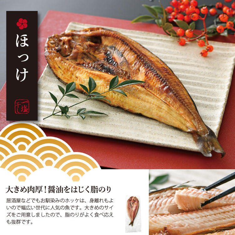 | 内容量 | 《9種・華セット》ほっけ1尾(200g)、さば1尾(170g)、あじ2尾(70g×2)、赤がれい1尾(120g)、のどぐろ2尾(55g×2)、はたはた3尾(100g)、いか1枚(70g)、ぶり味噌漬け1切れ(70g)、福井サーモン味噌漬け1切れ(60g) 《7種・松セット》ほっけ1尾(200g)、さんま3尾(200g)、赤がれい1尾(120g)、のどぐろ2尾(55g×2)、はたはた3尾(100g)、するめいか1枚(70g)、あじ1尾(70g) 《5種・竹セット》赤がれい2尾(120g×2)、ほっけ1尾(200g)、さば1尾(170g)、のどぐろ2尾(55g×2)、れんこ鯛1尾(100g) 《4種・梅セット》ほっけ1尾(200g)、のどぐろ2尾(55g×2)、するめいか1枚(70g)、あじ1尾(70g) |