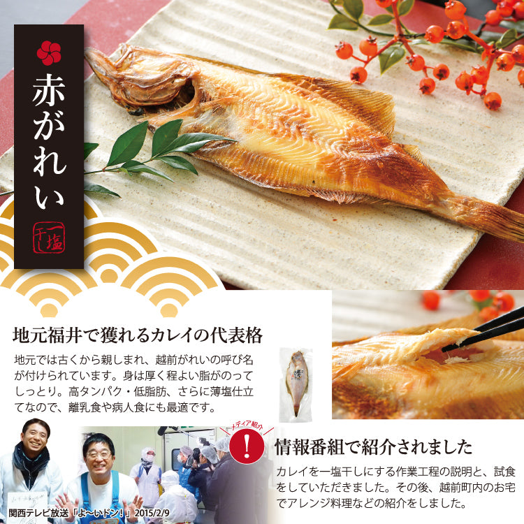 越前海岸の澄んだ海水から作られた純国産の自然海塩を使い、職人が魚の状態に合わせて丁寧に干し上げた一塩干しは、素材本来の旨みがしっかり味わえます。