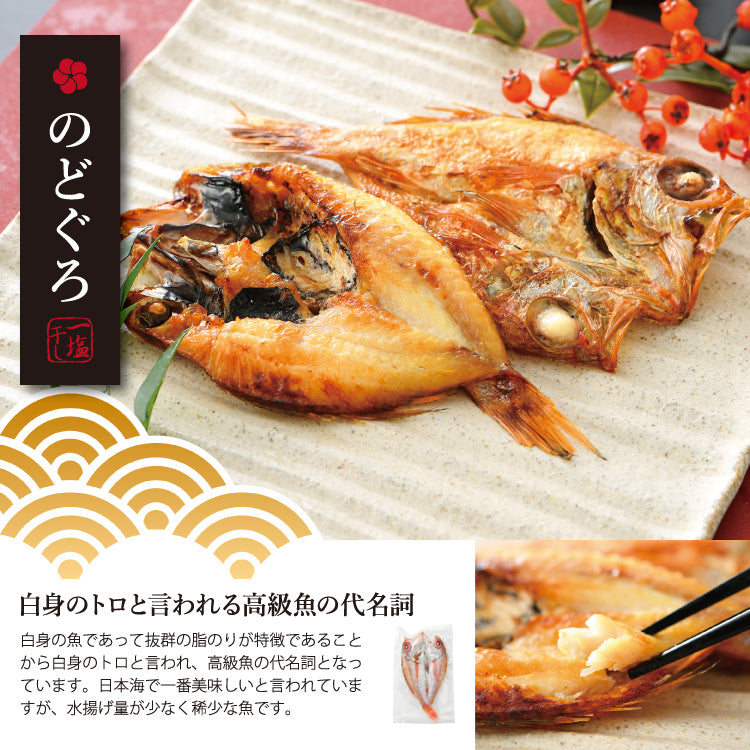 希少なのどぐろをはじめ、干物専門店が厳選した国産魚だけを使用した、保存料不使用の干物セットです。
