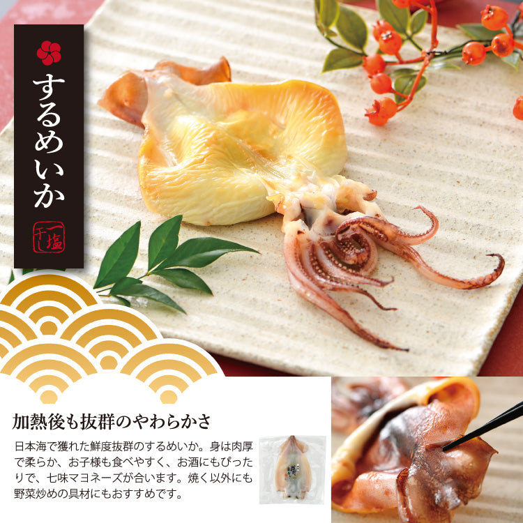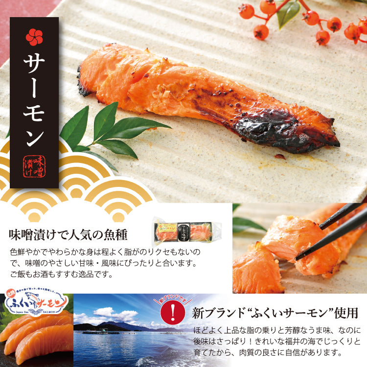| 原材料 | ほっけ(国産)、さば、あじ、赤がれい(福井県産)、のどぐろ(国産)、はたはた(福井県産)、するめいか(国産)、食塩、ぶり(国産)、サーモン(福井県産)、米みそ(米、大豆(遺伝子組み換えではない)、食塩、水飴)、砂糖、水飴、米発酵調味料、食塩、酒精、調味料(アミノ酸)、クチナシ色素 |