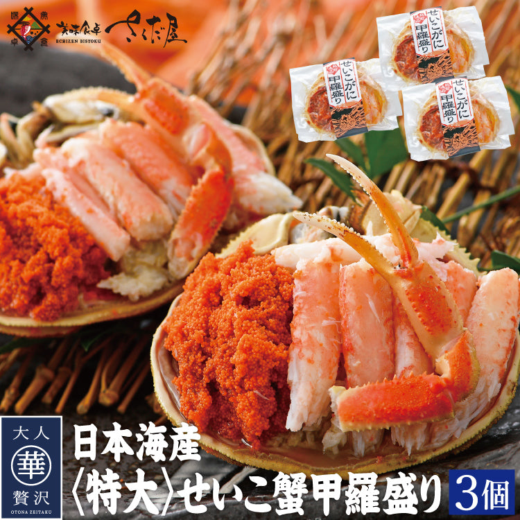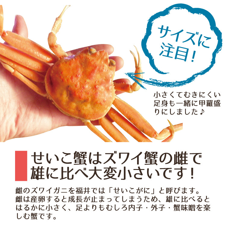 ポイント : 特大サイズを厳選!せいこ蟹は小さくて身出しも特に大変ですが、職人が丁寧に作業し甲羅盛りにしました。