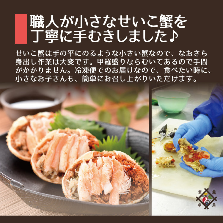 小さな甲羅に旨みが凝縮されたせいこ蟹を、職人が丁寧に身出しし、 食べやすい“甲羅盛り”に仕上げました。