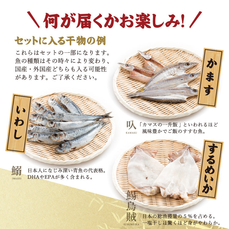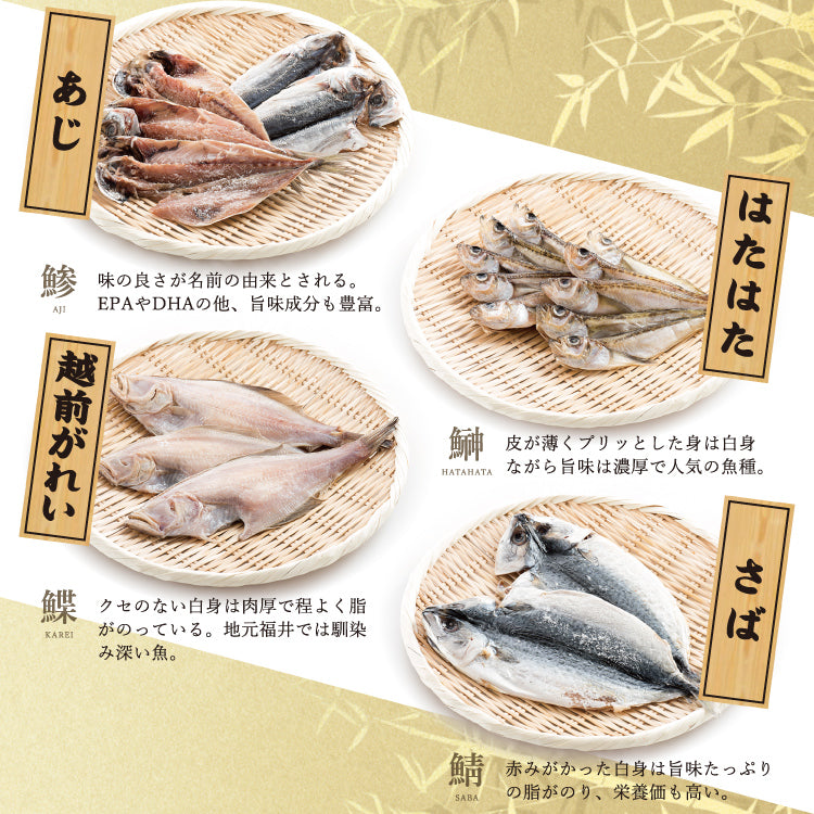| 原材料 | はたはた、赤がれい、なめたがれい(すべて福井県産) 真あじ、かます、真さば(すべて石川県産) 「丸干し」いわし(福井または石川県産) 「開き」いわし、真ほっけ(すべて北海道産) するめいか、さんま(国産)、食塩 ※上記以外の魚が入る場合もあり、産地は国産・外国産どちらも入る可能性がございます。 |